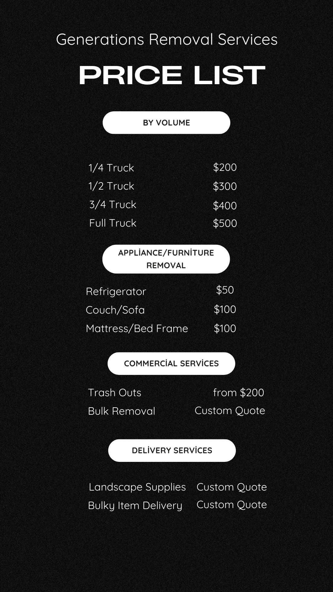 Prices listed are general estimates and may vary depending on the size, weight, and complexity of the job. Final pricing will be confirmed after an on-site assessment. Additional fees may apply for specialty items, excessive volume, or hazardous materials. We do our best to be transparent and fair—please don’t hesitate to reach out with questions!